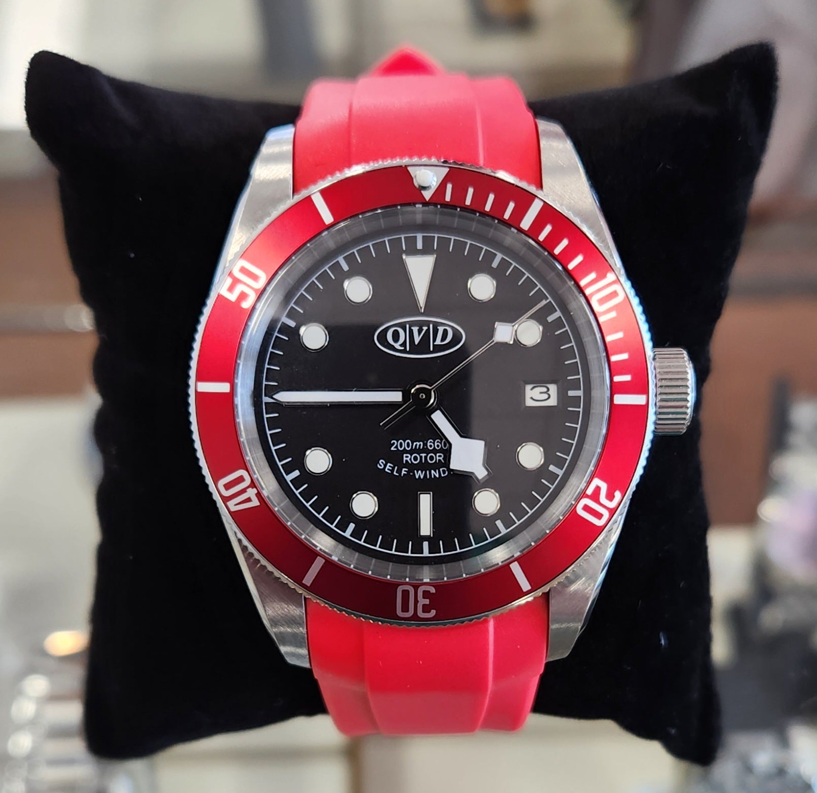 This popular design watch features a stainless case, a screw down crown, a stainless Oyster bracelet with a micro adjustable double lock clasp, a synthetic sapphire crystal for scratch resistant viewing clarity and an iconic Red ceramic bezel. Also available with a variety of silicone straps like the Red one pictured here. Powered by the TMI (Seiko Group) 24 jewel NH35A automatic movement for dependable and durable time keeping, with water resistance to 200 meters and the QVD Limited 1 year warranty.