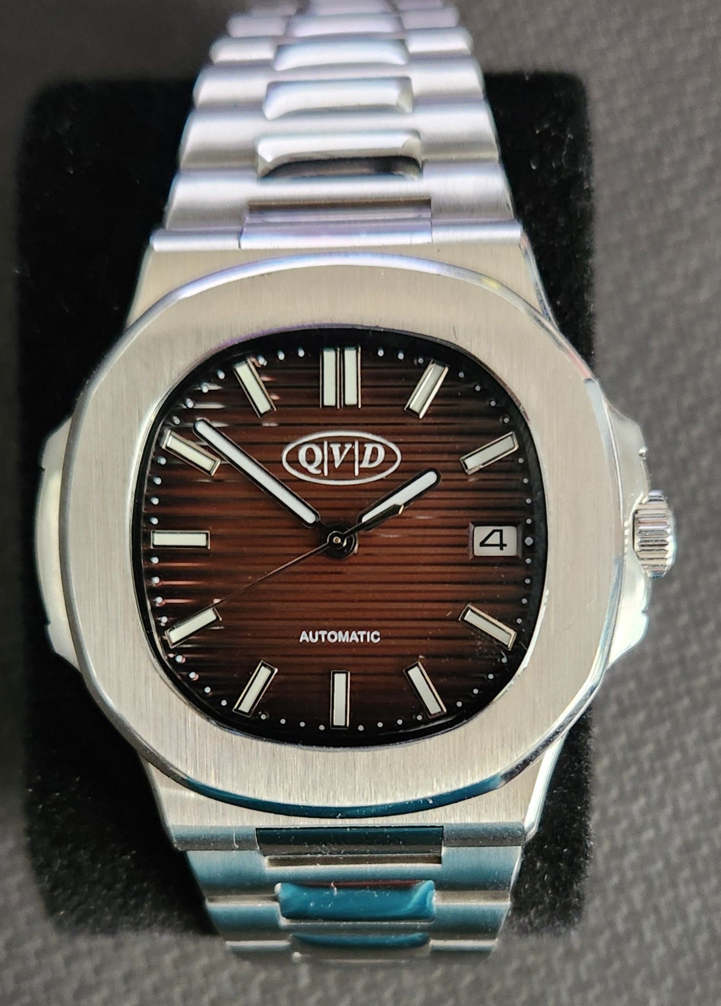 This unique watch has a retro inspired style. It features the reliable TMI (Seiko Group) NH35A 24 jewel automatic movement, a custom styled chocolate brown dial with ribbed accents. With 50 meters of water resistance, a synthetic sapphire crystal for scratch resistant clarity, a screw down crown for added moisture protection this watch is made to wear. The bracelet is solid stainless steel and it comes with our QVD 1 year limited warranty.