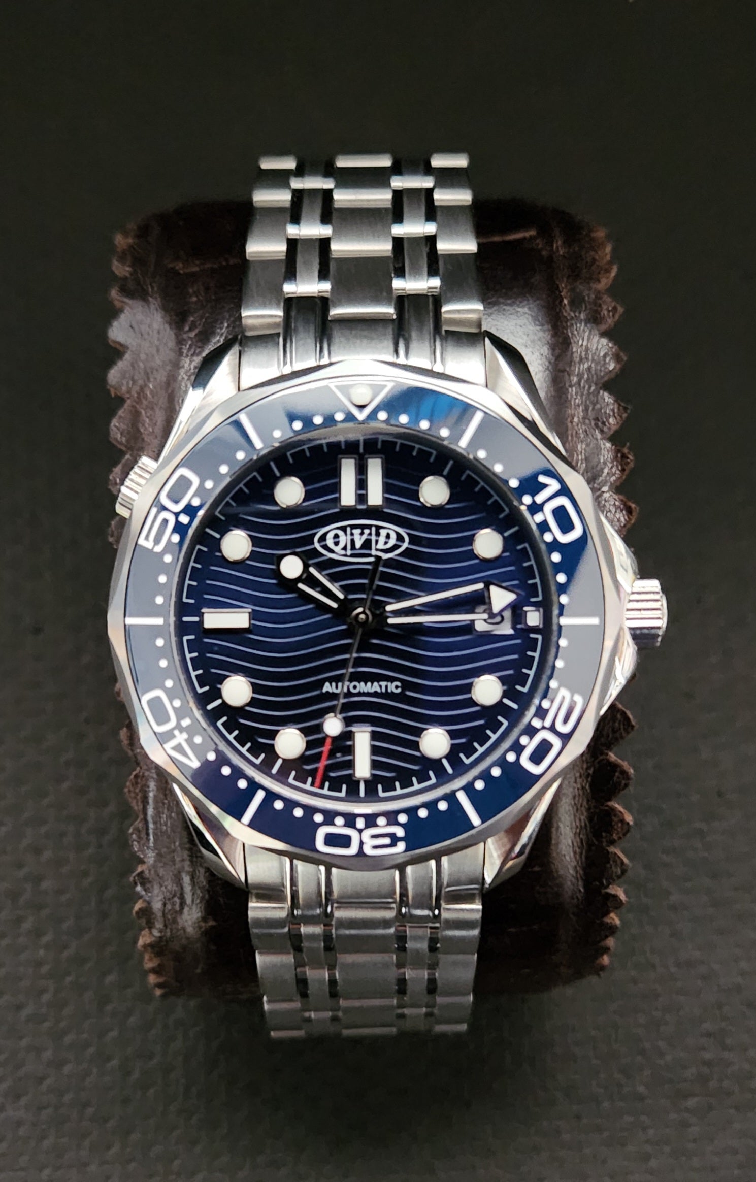 Powered by a NH 35A TMI (Seiko Group) 24 jewel automatic movement in a stainless steel case. Blue wave dial with a blue ceramic bezel. Features include a solid stainless steel multi-link bracelet, screw down crown for added protection, synthetic sapphire crystal for scratch resistant clarity and 100 meter water resistant. Watch is covered by the QVD Limited warranty for 1 year.