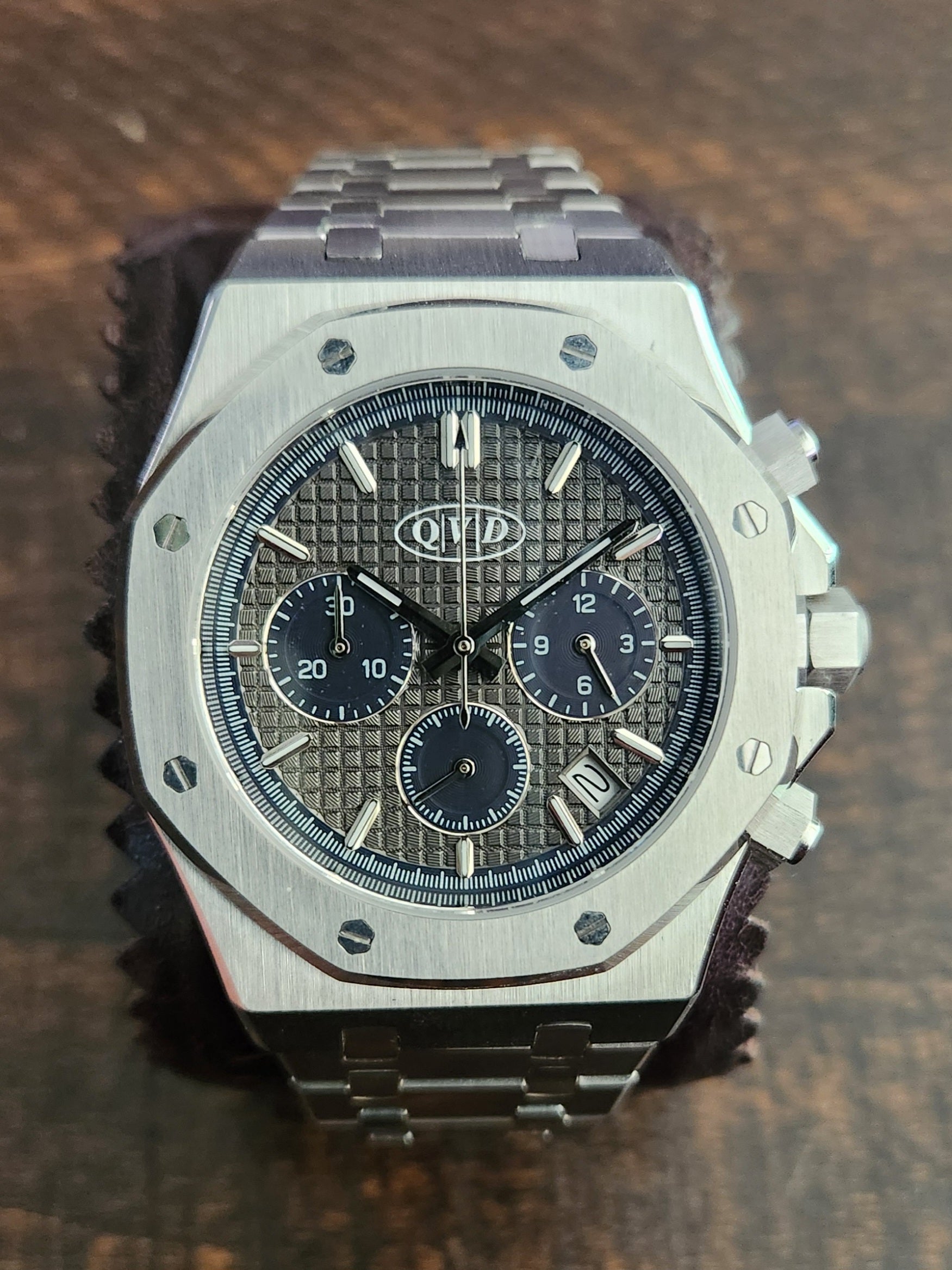 This 41 mm chronograph features an octagon shaped bezel adorned with 8 screws for an industrial look. The gray waffle textured dial features blue highlights and 3 blue sub dials for the chronograph functions. The bracelet is a multi-link stainless design that's comfortable as well as functional. The case and bracelet are solid stainless steel and the crystal is genuine sapphire. The movement is the Seiko VK63 mechaquartz chronograph movement with the date feature. This watch is a bold yet classic statement piece. Also available in Blue and Green.