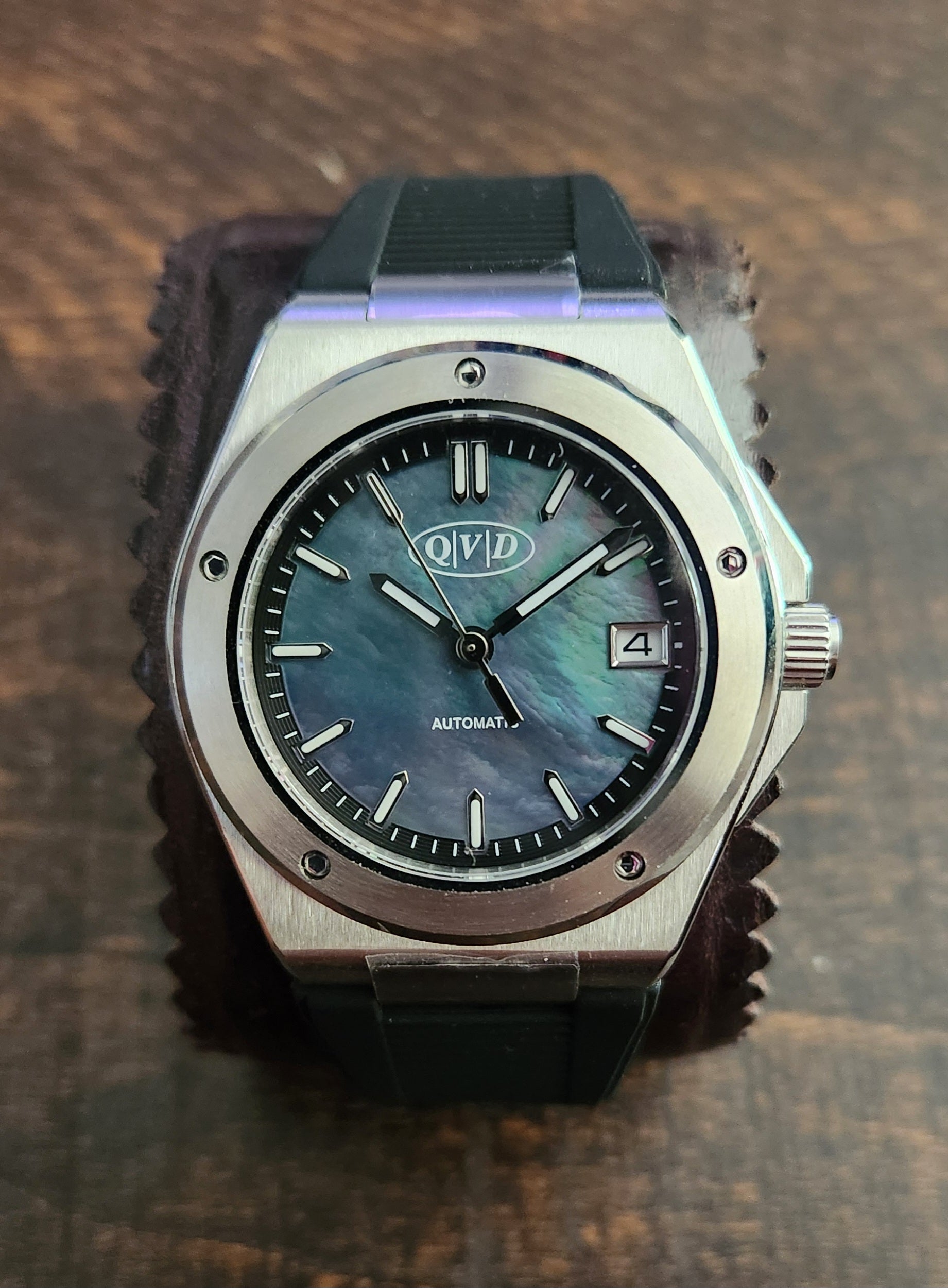 This uniquely designed mens watch starts with a stainless steel 40mm case, accent bolts around the bezel, a gorgeous black mother of pearl dial all attached to a genuine rubber strap. This model also features the date, a screw down crown, sapphire crystal and a genuine 24 jewel Seiko automatic movement for reliability and longevity.