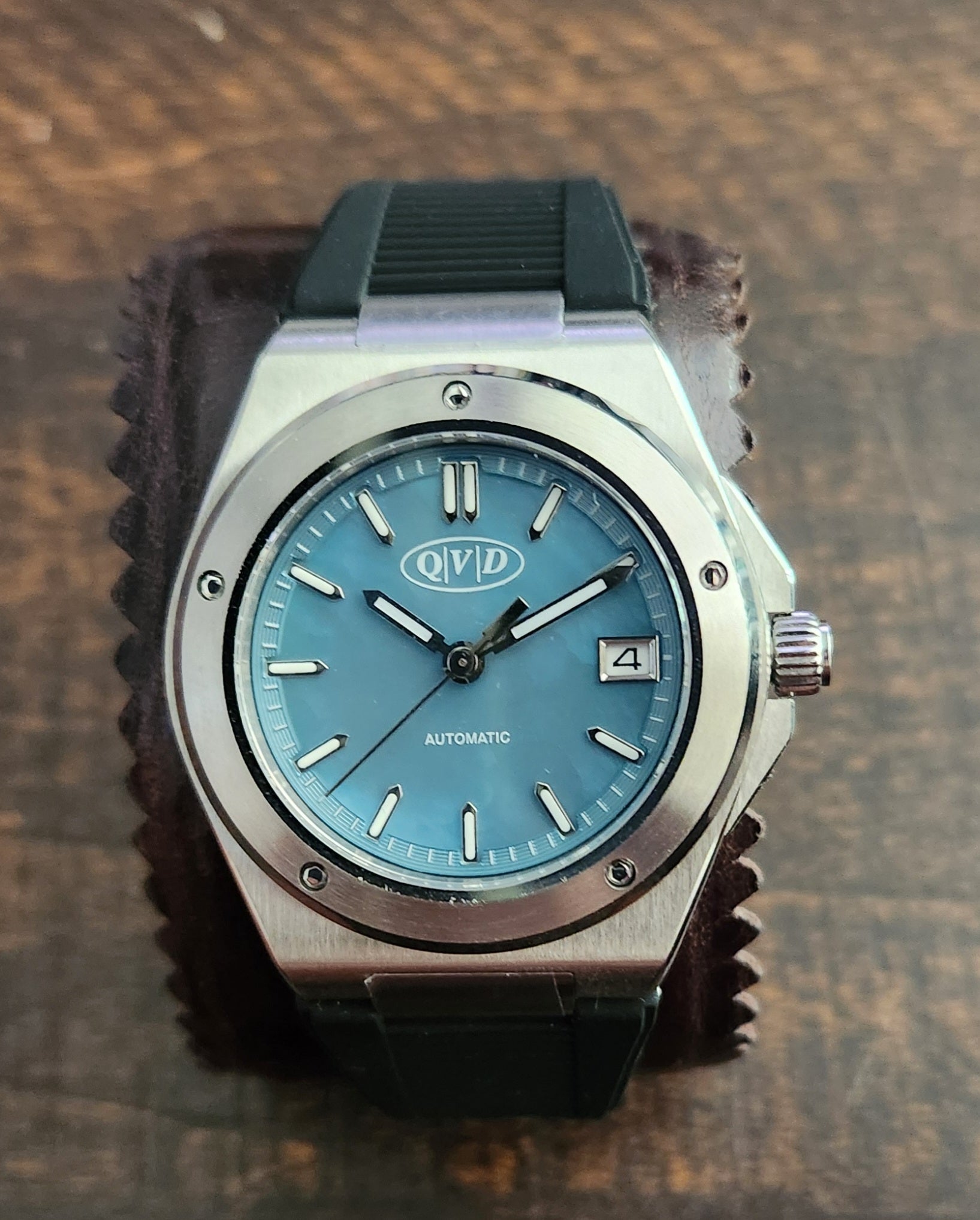 This uniquely designed mens watch starts with a stainless steel 40mm case, accent bolts around the bezel, a gorgeous blue mother of pearl dial all attached to a genuine rubber strap. This model also features the date, a screw down crown, sapphire crystal and a genuine 24 jewel Seiko automatic movement for reliability and longevity.