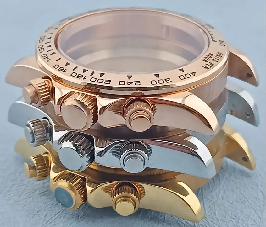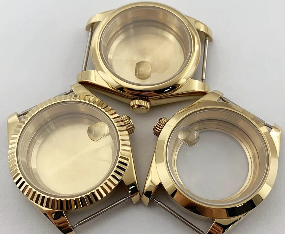 Watch cases hold the movement in place and protect it from the elements. They are available in a variety of sizes and styles. We only sell cases machined from solid stainless steel with screw down crowns. The accompanying images are examples of some of the options available.
